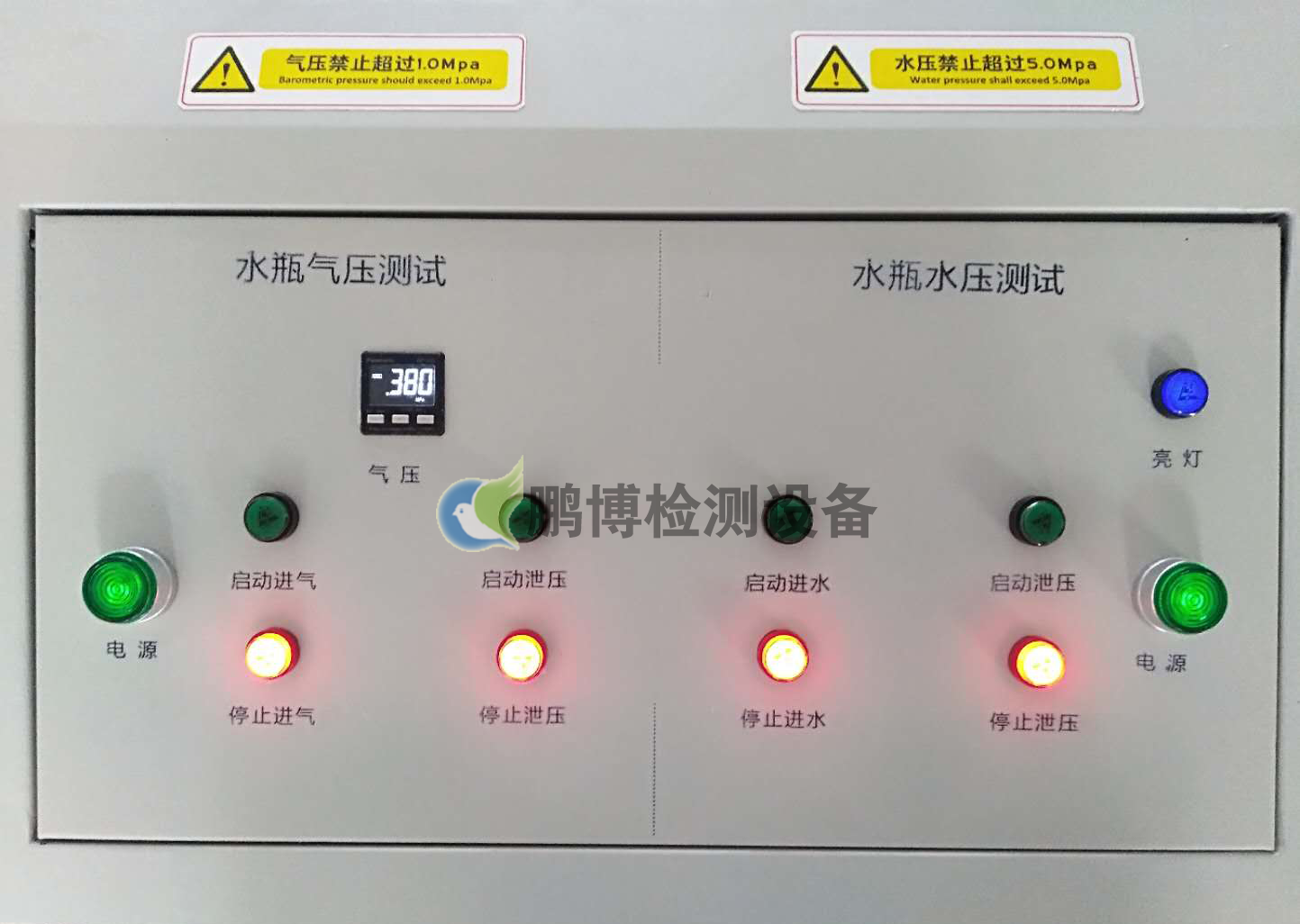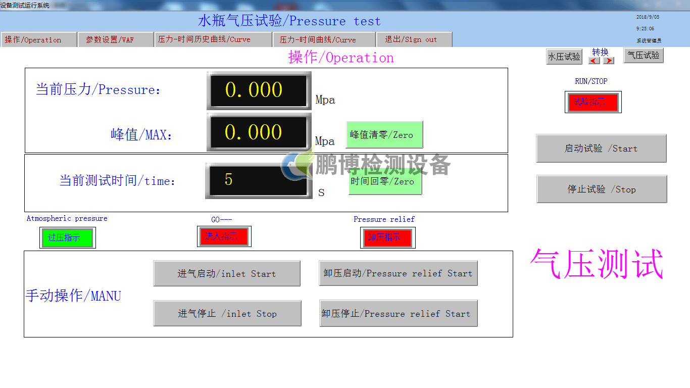 檢測(cè)瓶體承受內(nèi)部液體(水)的壓力大小,檢測(cè)水瓶的氣密性能,連接電腦軟件,電腦顯示相關(guān)數(shù)據(jù)及曲線圖。試驗(yàn)艙:大小:600*600*600mm,防爆,帶可視窗。